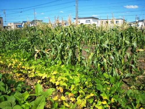 9月に入り、青空だけ見るとまさに「収穫の秋」なのだが、最高気温30℃オーバーの真夏日。枝豆で収穫して、残りは自家製味噌の材料として大豆に。長イモは掘ってみなければわからない。白菜は無農薬だと穴だらけ。