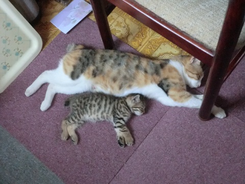 今日の会津地方は、梅雨が明けたと思わせるほどの暑さになりました。娘が子猫を見に遊びに来たので、写真撮影者は娘です。一応家で図面を描く練習でもと会社からテキストを持ってきておいたのですが、この暑さで断念しました。午前中に娘を迎えに行ってきて連れてきました。AKB48が好きでCDからウォークマンへ入れてやりました。午後は息子の自転車がパンクしたので、直しにホームセンターに行き修理をしてもらいました。じっとしていても汗が出てきます。猫たちも暑さでグッタリしています。 親子揃ってグッタリしています。 午前中はまだ元気がありました。だんだん横になる事が多い。ついに廊下で寝てしまった。