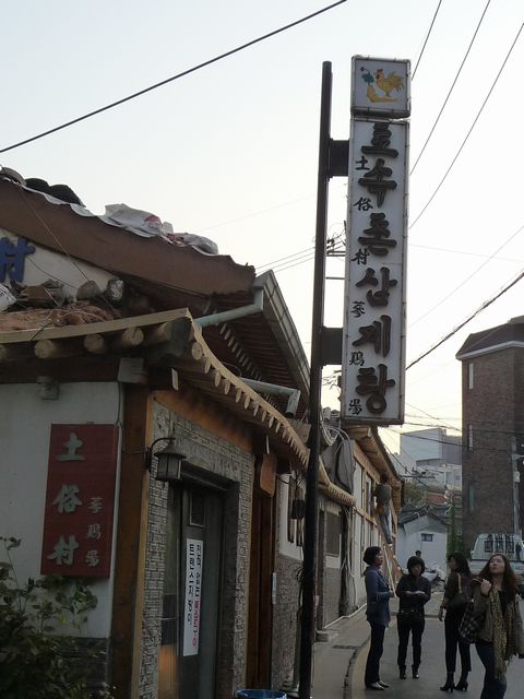ひと休み後、弘大(ホンデ)へ。ここらは大学があって学生の街という感じでした。姪に頼まれたカラーコンタクトを買って、夕ご飯に選んだのは参鶏湯(サムゲタン)。地下鉄3号線、景福宮(キョンボックン)駅から歩いてちょっとの土俗村(トソッチョン)へ。韓国で一番有名な店らしいです。そしてこれが参鶏湯一人前。若鶏が丸1羽入っています。 おいし~~まずお肉を取り出し、好みによって備え付けの塩をつけながら食べます。キムチ、カクテキ、生のニンニクスライスを箸やすめにしながらあらかた肉を食べた後、残ったもち米とスープをいただきます。 これで値段は15,000ウォン。ってことは、日本円で千円ぐらい。安っす~~。お勧めです。場所もすぐわかる場所にあります。予約しなくともすぐ入れました。 ご飯を食べた後、鍾路3街駅の近辺でコーヒーを飲んだりして時間を潰し、Jumpというショーを見ました。 韓国伝統武芸であるテコンドーをベースにしたしたアクロバットパフォーマンスです。 日頃から鍛錬をしている武術一家。そこにメガネを掛けた青年が加わり今日も修行を。やがて娘と青年は恋心を。そんな中、夜になり泥棒が家に侵入。果たして一家の運命は?若い二人のその後は・・・ ってなストーリーを最小限の英単語ぐらいの言葉しかなく、見せてくれます。笑えます。子供でも楽しめる内容です。楽しんだ後、街を散策。韓国では中のいい女の子同士が腕を組んだりして並んで歩くことは知っていましたが、男同士も腕を組んだり肩を組んだりする姿が目立ちました。日本ではあまりないですよね~(最近の若い男の人達は腕組んだりするのかなぁ)ちょっと小腹をすかせたので、とあるお店へ・・・ 鳥の唐揚げのお店を発見。イメージキャラクターはカラ揚げだけにKARA(カラ)ではなくて少女時代でした。 頼んだのはこちらとビール。・・・食べ切れませんでした。(つづく)