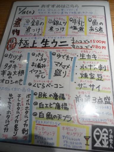 28日、土曜日午後から会社に行き、9時頃帰路に・・・・・そして、また「立ち呑み魚金」へ。呑みに行きたいから土曜日仕事をするのか・・・・・ 本日の日替わりメニュー 「牛すじ塩煮」380円さっぱりした塩味です。定番メニューから、「刺身ぶつ切り」580円。 中身は、マグロ、カツオ、ハマチ、タイ、イカ、タコ、アジ、ホタルイカ、子持ちわかめ、底にタイラ貝があって、全部で10種でした。いろんな味が楽しめます。 続いて「アナゴの天ぷら盛り合わせ」580円(だったかな)。奥にアナゴ2切れ1匹分。その手前にヤングコーン2本とホタテの串刺し2本 。天つゆがちょっとしょっぱかったかな・・・ 生ビール1杯。日本酒2合を飲んで3,080円。そして10時。本当の帰路につきました。 (帰り際にパチリ)(こちらは「イタリアンバー・UOKIN」 。駅に向かう途中でパチリ)