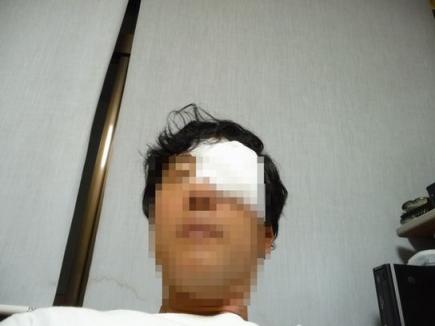 16日(火)今日は10時半に病院に行って目の出来物の切開です。10時10分には受付票を出して待っていたのですが、11時過ぎまで待たされました。前の手術が長引いているとのこと。やっと私の番になり、ベッドに横になります。手術をするのは看てもらっている女医先生。・・・ともう一人女性の先生がいるぞ。(目を切開するのできょろきょろすることもできず、声の感じからしてですが)それと看護士さんが2人ぐらい? 目蓋に麻酔を「チクッ!」・・・結構痛い。目蓋をめっくって裏にメスが入ります。(痛いよ~) 切った後、中の膿を出しているのか目蓋をつねっている感じです。(痛いよ~~)「2針ぐらい縫いますからね~」と女医先生。「チクッ!」「チクッ!!」・・・・(痛いよ~~~軟膏を塗って、看護士さんがガーゼを当て、「眼帯ってこんなもんでいいでしょうか?」といって、女医先生「いいんじゃない」と・・・(アイパッチのようなものをしてくれるんじゃないんだ?) 家に帰って自分をパチリ!(頭の毛が立っているぞ!)これじゃ、格好悪くて外に飲みにいけない。(って、今日は飲んじゃいけないんだって。おとなしくしています。