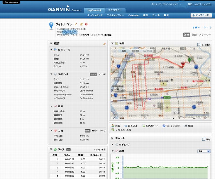 昨日、ForeAthleteが直って送られてきました。電源供給用のクリップも含めて19,110円。痛いな~。修理と言っても取替えみたいな感じです。 戻ってきて、早速使ってみました。そしてPC取り込みをしようとしたら、付属のが新しいForeAthleteを認識してくれません。いろいろ試していたら、ガーミンのサイトにデータをアップするようなサービスができているようでした。アップしました。記録はこんな風に確認できました。 走ったところはすぐグーグルのMAPに表示されます。