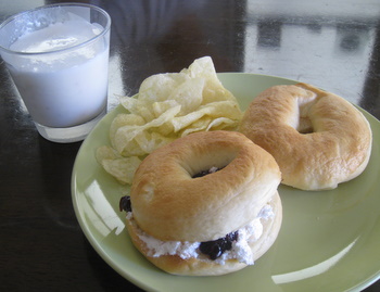 今日は旦那様の旅立ちの日張り切って手作りパンといっても、昨夜作ったベーグルイケアとコストコのコラボレーションイケア1枚99円のプレートにプライスレスの手作りベーグルひとつはプレーンひとつはコストコで購入した持て余し気味のココナッツケーキとお向かいさんからいただいたブルーベリーのジャム添えてあるのは大好きLaysのポテトチップス今日のベーグルも上出来でしたww