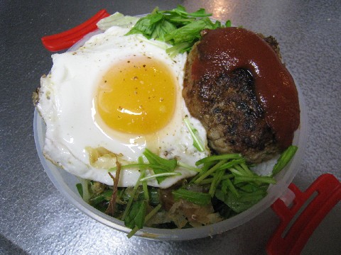 お弁当といっても私のじゃあありません。旦那様のお弁当です最近はなんでも丼系ご飯に乗っけちゃうのがブーム東南アジア飯っぽいでしょなんちゃってロコモコ丼金曜日の夜ご飯に食べきらなかったビッグサイズのハンバーグにべっとりケチャップ目玉焼きのっけ いいなぁ。盛りながら誘惑される弁当だ下に引いてあるレタスの上にはマヨネーズがついてるのマヨネーズとケチャップのコラボにハンバーグが出会い、そして目玉焼きにうおー。いいないいなお弁当あたしも作ってもらいたいなーん。。。