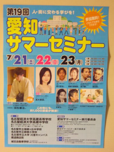 今日サマーセミナー(通称サマセミ)からお知らせが届いた・・・ 担当は23日(月)1限10:00~11:40 2限12:30~14:10会場は名古屋経済大学高蔵高等学校 教室詳しくはこちらをポチッと・・・ハイパー講座検索で登録ID「64」で検索して下さいねェ~ブログのアドレス間違ってるけど・・・(笑)他にも興味がそそられる講座が満載・・・是非お越し下さ~い。みんなで盛り上がりましょう~そして先日のブログで紹介した「久保田競(きそう)教授」のセミナーは20名の人数限定先着順です。テーマは「五感を活かす脳の活用法」興味がある方はここにメッセージ入れて下さい。 応援お願いねェ~ こちらをクリックよろしこ~ お陰様で109位ですよ~