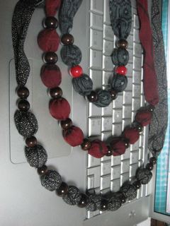 Today,we ware gathered and made necklaces.These clothes are kimono clothes.So these necklaces are reformed kimono.It was let into styrene foam and wood beads.I made three necklaces that's easy.One of the member said it's like yamabusi.Others said it's like ohenro of sikoku.We had a happy time.