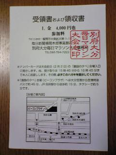 2008年2月3日(日)、正午号砲。第57回別府大分毎日マラソンへの切符が届きました。マラソンを始めて1年と少し。恐らく、参加選手の中で、私が一番経験が少ない事でしょう。周りの人には、私が10歳若かったら世界が変わっていたと言われます。今から、どれくらい早くなるかは未知数。年齢との戦いになると思います。去年11月の初フルマラソンは、予想以上にボロボロになり勉強になりました。今回は、大舞台ですので楽しく走りたいのですが、記録の大幅更新も狙いたい。目標タイムは2時間35分。普通に行けば大丈夫なタイムですが、フルマラソンは何があるか分かりません。いつもの事ですが、全力で頑張ります!走るのが楽しみですね!