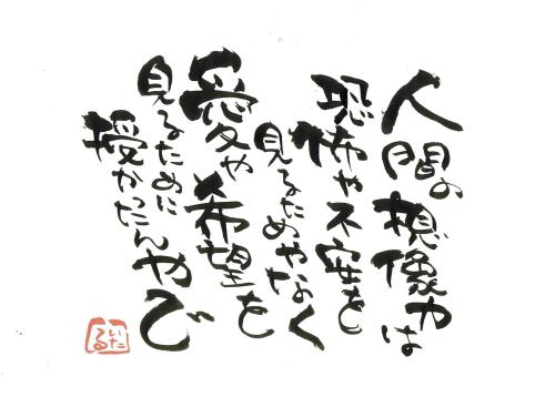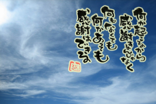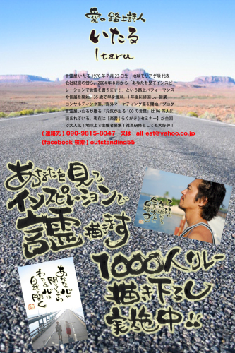 今日も清々しい朝!最幸の1日の始まりだぁ〜^^yてんつくマンのパクリで、ふと、「あなたを見てインスピレーションで言霊描きます!」ってのをスタートしたのが2004年8月。これで人生の新たな道が拓いてん。齋藤サトルーチの言葉に勝手に影響を受けて、ふと、「あなたを見てインスピレーションで言霊描きます!1000人リレー!」ってのをスタートしたのが2013年5月。これで人生の新たな道が拓きつつあるねん。たまたまの真似ごと、たまたまの思い付きでスタートしたことやけどもの凄い勢いで人生が変わっていくことってあるよね。今、それを実感してるねん。そんで、たまたま顔が浮かんだ2人の知人、眞喜子さんと元美さんからスタートして次へのバトンをもらいながらリレーしていく。ルールはこの2人からのリレー。次の人を紹介してもらうまで立ち止まって待つ。片方は勢い良く広がり始めた。もう片方は1ヶ月経っても次の紹介が出ーへんかった。でも、根気よく信じて待つ。1人、また1人と出て来た。そして居酒屋やカフェに繋がって加速し始めた。すると、フェイスブックの記事を見て「私のところにも来て!」って依頼が入り始めた。「よしっ、これも記事を出した人のリレーとしよう!」ってことで引き受けたら全国に飛び火し始めてん。「活動エリアってどの辺りですか?」って質問されることがあるねん。こう答えてる。「はい、地球上ならどこでも^^y」人との出逢いで人生は変わる。ご縁ってほんま有り難い。繋いで繋いで、繋がって繋がって、笑顔のリレー、ハッピーの連鎖。無限に広がれーーーーーーーーーーーーーーーーーっ!素敵な奇跡は起こり続けます!感動します。「車窓に映った親切」むっちゃ感動のショートムービー『承認』言霊屋いたるのアメリカムービー(1)言霊屋いたるのアメリカムービー(2)小さなバスケットヒーロー1小さなバスケットヒーロー2ニックさてさて、今日は何位?ブログランキング熱復活しました!徐々に上がってきています!< 注意深くお金を使うために >私たちが商品を買うために支払ったお金は、世界のどこかで、誰かを迫害したり殺したりするために役立っているかもしれません。私たちには注意深くお金を使う責任があります。注意深くお金を使うために!●日本人口1億3千万人。割り箸の消費は年間で250億膳と言われています。97%が輸入、木造建築2万件分にも相当します。樹木が伐採されれば雨が降らず砂漠化が広がります。すると植物は育ちません。同じ地球のどこかで1日に4万人の人が餓死しています。割り箸の消費を止めることで救われる命があるのです。できることから始めてみませんか。◇◆◇ 『お知らせ』 ◇◆◇ついに実現しました。携帯電話専用『いたるの世界』動画で見れます!是非、ご覧下さい。『地球が100人の村だったら』★★★ 応援してます!★★★心に響く歌詞、歌声を聴かせてくれます。いたるはサクラシンマチを応援しています。是非、みなさんも聴いてみてくださいね。◇◆◇mixiです!◇◆◇ミクシーにいる人は是非、遊びに来てくださいね。mixiって何?って言う人はメール下さればご招待いたします!◆◇◆◇いたるファン倶楽部です!◇◆◇◆素敵な奇跡は起こり続けます!