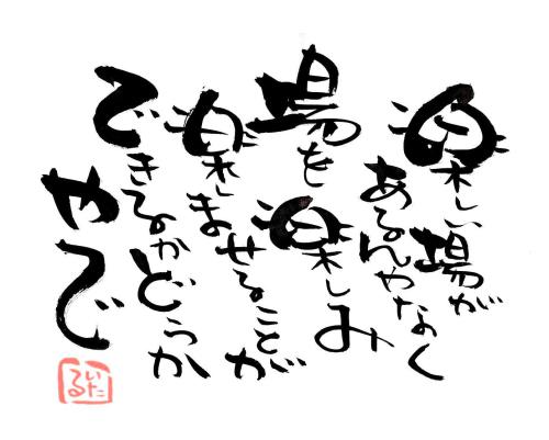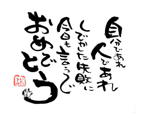 昨日は久々に筆を持ってん。思い付いた事を描いてると楽しいね〜人間、生きてりゃいろんなことが起こるやん。自分にとって都合のいいことも、そうでないことも。次々にやって来る出来事に対して、どう捉え、どう対処するかによって、自分の人生が創られて来たんやなぁ〜ってしみじみ思うねん。俺ね、いつ頃やったか忘れたけど、いつもピリピリしてた時期があってん。会う人会う人にもいつも上から目線。何か買う時も、お客として行く時も、とにかく自分の優位性を利用して、ひとこと言って、満足してた時期。。振り返ると恥ずかしい^^最近お会いした50代の女性がそんな感じでね、そのお姿を見て、ふと思い出してん。人間って可愛いよね。動物と一緒で不可解な行動の中にもそれぞれの理由がしっかり存在するもんね^^すべてを受け止める器量を育てていきたいって思えてん。考えたると、起こる出来事ってコントロールできんやん。「自分にとって都合のいいことばっか起これ!」って願ったところで、それは現実にはならんけど、「自分に取って都合のいいように解釈します!」って宣言やったらいつでも出来るやん^^y起きた現実をコントロールしようとするんやなく、自分の解釈をコントロールする!素敵な奇跡は起こり続けます!感動します。「車窓に映った親切」むっちゃ感動のショートムービー『承認』言霊屋いたるのアメリカムービー(1)言霊屋いたるのアメリカムービー(2)小さなバスケットヒーロー1小さなバスケットヒーロー2ニックさてさて、今日は何位?ブログランキング熱復活しました!徐々に上がってきています!< 注意深くお金を使うために >私たちが商品を買うために支払ったお金は、世界のどこかで、誰かを迫害したり殺したりするために役立っているかもしれません。私たちには注意深くお金を使う責任があります。注意深くお金を使うために!●日本人口1億3千万人。割り箸の消費は年間で250億膳と言われています。97%が輸入、木造建築2万件分にも相当します。樹木が伐採されれば雨が降らず砂漠化が広がります。すると植物は育ちません。同じ地球のどこかで1日に4万人の人が餓死しています。割り箸の消費を止めることで救われる命があるのです。できることから始めてみませんか。◇◆◇ 『お知らせ』 ◇◆◇ついに実現しました。携帯電話専用『いたるの世界』動画で見れます!是非、ご覧下さい。『地球が100人の村だったら』★★★ 応援してます!★★★心に響く歌詞、歌声を聴かせてくれます。いたるはサクラシンマチを応援しています。是非、みなさんも聴いてみてくださいね。◇◆◇FaceBookです!◇◆◇フェイスブックにいる人は是非、遊びに来てくださいね。◆◇◆◇いたるファン倶楽部です!◇◆◇◆素敵な奇跡は起こり続けます!