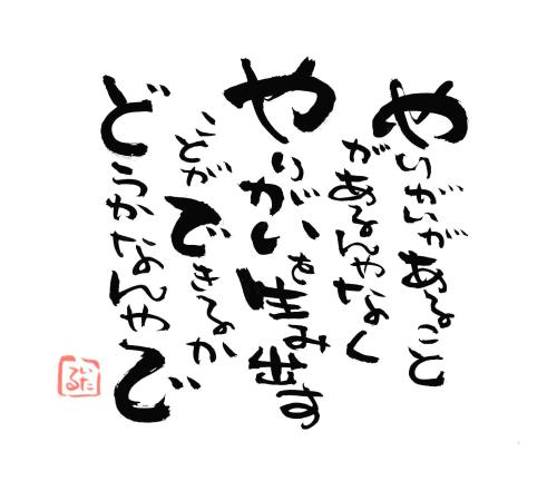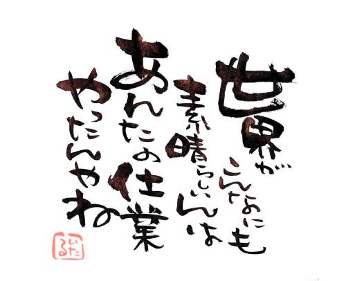 あなたを見てインスピレーションで言霊を描きます!1000人リレーの笑顔シャワーをスタート!過去にご縁して言霊を描かせてもらった人、路上で描かせてもらった人、もし、俺の言霊があればフェイスブックへの写真アップのご協力を宜しくでーっす!【言霊1000人リレーの笑顔シャワー in Facebook】をクリックしてね!会社経営時代に新卒採用してたとき、年間600人くらいの学生さんと出逢っててん。面接を通していろんな気付きと学びをもらったなぁ〜大半の学生さんが言う言葉。。「やりがいのある仕事をしたい」「楽しい職場で働きたい」「公平に評価されたい」などなど。学生のうちから起業してしまうほんの一部を除いてはみんなバイトしかしたことないし、表面的な選択基準しか持てないのは仕方ないけど、本質を見抜いて、しっかりした軸を持って、面接に挑んでくる学生もおったなぁ。俺が就職したときは、ただただモテたいがためにかっちょいい車が欲しかったから、学歴不問で給料のいい営業会社を選んだだけやったし^^社会に入って、いろんなギャップを感じて、楽しいことも、苦いことも、いろんな感情を味わいながら気付いていくよね。「やりがいのあること」があるんやなく「やりがいを生み出す」ことができるかどうか、「楽しい職場」があるんやなく、「楽しめる自分」になれるかどうか、「公平な人事考課」があれば納得するかってことより、「誰もが手放したくない人間」になるかどうか。「幸せ」とは「幸せ」を感じる力。「感謝」を見付ける意志力やねん。今日も「楽しむ!」ことを全快でやってこ!素敵な奇跡は起こり続けます!感動します。「車窓に映った親切」むっちゃ感動のショートムービー『承認』言霊屋いたるのアメリカムービー(1)言霊屋いたるのアメリカムービー(2)小さなバスケットヒーロー1小さなバスケットヒーロー2ニックさてさて、今日は何位?ブログランキング熱復活しました!徐々に上がってきています!< 注意深くお金を使うために >私たちが商品を買うために支払ったお金は、世界のどこかで、誰かを迫害したり殺したりするために役立っているかもしれません。私たちには注意深くお金を使う責任があります。注意深くお金を使うために!●日本人口1億3千万人。割り箸の消費は年間で250億膳と言われています。97%が輸入、木造建築2万件分にも相当します。樹木が伐採されれば雨が降らず砂漠化が広がります。すると植物は育ちません。同じ地球のどこかで1日に4万人の人が餓死しています。割り箸の消費を止めることで救われる命があるのです。できることから始めてみませんか。◇◆◇ 『お知らせ』 ◇◆◇ついに実現しました。携帯電話専用『いたるの世界』動画で見れます!是非、ご覧下さい。『地球が100人の村だったら』★★★ 応援してます!★★★心に響く歌詞、歌声を聴かせてくれます。いたるはサクラシンマチを応援しています。是非、みなさんも聴いてみてくださいね。◇◆◇FaceBookです!◇◆◇フェイスブックにいる人は是非、遊びに来てくださいね。◆◇◆◇いたるファン倶楽部です!◇◆◇◆素敵な奇跡は起こり続けます!