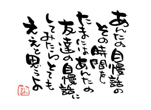 今日は朝から山口に向かいまーーーーっす!山口県周防市で初の【楽書(らくがき)セミナー】でーっす!コミュニケーションって「思いやり」と「技術」って本に書いてあった。相手に興味を持って70%を「聴く」側に回り、20%を「話す」と上手くいくよ〜って書いてあった。「また会いたい」って思ってもらえるにはどうしたらいいんやろうね? 俺はどんな人と「また会いたい」って思うんやろう〜って考えてみてん。気が会う人。一緒にいて楽しい人。一緒にいて学ばせてくれる人。話を聴いてくれる人。有益なものをもたらしてくれる人。刺激をくれる人。なんとなく繋がりを感じる人。人それぞれ「また会いたい」って思う人は違うやん?逆に「もう会いたくない」って思う人はどんな人やろ?最近ね、自慢話をずーーーーっとする人と知り合ってん。自分がどう凄いのか、会う人がこんなに賞賛してくれるとか、自分は本物だとか、ずーーーっとしゃべってはるねん。聴いてるとこっちまで嬉しくなるんやけどね、もし、それが1時間ほど続いたとしたらどう?そのうちね、人と比べて自分は凄い!ってなってくるから、人のことを落とし始めはるねん。「あの人のここはどうで、あの人のこんなとこはこうで・・・」って。それも延々と続くんよね〜俺も無意識にそうなってるときってあるんかな。。気付いてへんけど、きっとあるんやろうね。人と人って繋がりやん。繋がりの中で生きてきて、繋がりの中でこれからも生きていく。自分で完結するのって違うよね〜だから、友達とか知人の自慢話をしたらええと思うねん。「俺の友人でね、ここが素晴らしくて、こんな才能があって・・・」って感じで。そしたら「私もその人に会いたい!」ってなるやん?そうして繋がっていったらハッピーやん!自慢するなら「自分」より「家族」や「友人」!それでいきましょ^^y素敵な奇跡は起こり続けます!感動します。「車窓に映った親切」むっちゃ感動のショートムービー『承認』言霊屋いたるのアメリカムービー(1)言霊屋いたるのアメリカムービー(2)小さなバスケットヒーロー1小さなバスケットヒーロー2ニックさてさて、今日は何位?ブログランキング熱復活しました!徐々に上がってきています!< 注意深くお金を使うために >私たちが商品を買うために支払ったお金は、世界のどこかで、誰かを迫害したり殺したりするために役立っているかもしれません。私たちには注意深くお金を使う責任があります。注意深くお金を使うために!●日本人口1億3千万人。割り箸の消費は年間で250億膳と言われています。97%が輸入、木造建築2万件分にも相当します。樹木が伐採されれば雨が降らず砂漠化が広がります。すると植物は育ちません。同じ地球のどこかで1日に4万人の人が餓死しています。割り箸の消費を止めることで救われる命があるのです。できることから始めてみませんか。◇◆◇ 『お知らせ』 ◇◆◇ついに実現しました。携帯電話専用『いたるの世界』動画で見れます!是非、ご覧下さい。『地球が100人の村だったら』★★★ 応援してます!★★★心に響く歌詞、歌声を聴かせてくれます。いたるはサクラシンマチを応援しています。是非、みなさんも聴いてみてくださいね。◇◆◇FaceBookです!◇◆◇フェイスブックにいる人は是非、遊びに来てくださいね。◆◇◆◇いたるファン倶楽部です!◇◆◇◆素敵な奇跡は起こり続けます!