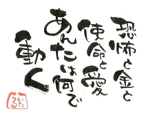 今日から東京〜^^茅ヶ崎で「らくがきセミナー」でーっす。『楽書セミナー in 茅ヶ崎』飛び入りも来てね^^人間って可愛い生き物よね。自分のことは棚に上げて、人のことを言うのは得意^^「あぁしたらええのに・・・」「こうしたらええのに・・・」「なんでこうせえへんねんやろう・・・」いざ自分がやるとなったら怖じ気ずくくせに。もちろん、俺も例に漏れず^^ひとつひとつやるだけよね^^焦らず、腐らず、投げ出さず、コツコツと。自分の土台は自分で築く!今日も素敵な奇跡は起こり続けます!あなたの健康とアンチエイジングを実現する【ヘルスケアクラブ】感動します。「車窓に映った親切」むっちゃ感動のショートムービー『承認』言霊屋いたるのアメリカムービー小さなバスケットヒーロー1小さなバスケットヒーロー2ニックさてさて、今日は何位?ブログランキング熱復活しました!徐々に上がってきています!< 注意深くお金を使うために >私たちが商品を買うために支払ったお金は、世界のどこかで、誰かを迫害したり殺したりするために役立っているかもしれません。私たちには注意深くお金を使う責任があります。注意深くお金を使うために!●日本人口1億3千万人。割り箸の消費は年間で250億膳と言われています。97%が輸入、木造建築2万件分にも相当します。樹木が伐採されれば雨が降らず砂漠化が広がります。すると植物は育ちません。同じ地球のどこかで1日に4万人の人が餓死しています。割り箸の消費を止めることで救われる命があるのです。できることから始めてみませんか。動画で見れます!是非、ご覧下さい。『地球が100人の村だったら』◇◆◇FaceBookです!◇◆◇フェイスブックにいる人は是非、遊びに来てくださいね。◆◇◆◇いたるファン倶楽部です!◇◆◇◆素敵な奇跡は起こり続けます!
