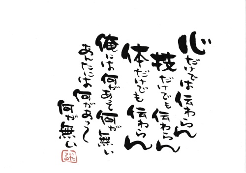 今日も東京は曇り空〜昨日はふと気付けば朝の4時までしゃべってた^^今日、関西に帰りまーーーーーーっす!何をするにしても「心・技・体」が大事よね。調和が取れてるとええ感じになるねん。俺ね、小学1年生から習字に行かされてん。通知表の先生のコメント欄に1年から6年までぜーーーんぶ同じことが書いてあるねん。それは・・・「落ち着きが無い・・・」^^だから正座する習い事に行かされたんかなぁ〜今、振り返ると親に感謝しかないんやけどね(笑)書道の世界って「臨書」が基本やねん。見本どおりに書くことをひたすら繰り返す。小学生のときから要領が良かったんか、飲み込みが早かったんか人と比べてなんやけど俺は先生に字の修正をされることが少なかったと思うわ。それって真似る技術が備わったってことやん?心を無にして姿勢を正し筆を滑らせる。まさに心技体なんよね。バランスが取れてるのがイケてるねん。心を磨き続ける。技を磨き続ける。体を磨き続ける。続ける「道」の精神ってのが大事よね。今日も素敵な奇跡は起こり続けます!◉特別割引のご案内!ニックブイチチと池松耕次が夢の共演 in 東京ビッグサイト!5月8日、9日の2日間!ニックブイチチイベント開催会社様より我々チームコージの皆様へ最後のプレゼントをいただきました~!キャンペーン期間 2015年2月5日~3月31日(お申し込みとお振り込み完了に限る)VIP席 ¥250,000 → ¥189,800通訳機 ¥15,000 → ¥10,000*2月28日までの特典もう1人【一般席と翻訳機をプレゼント】一般席 ¥60,000 → ¥29,800通訳機 ¥15,000 → ¥10,000*3月31日までの特典もう1人【一般席と翻訳機をプレゼント】お申し込みはこちらから紹介者の欄に『いたる』苗字『い』 名前『たる』と入力下さいませ(^^)https://ssl.formman.com/form/pc/nm0vHgSBrThCtIKG/ニックイベント概要&申し込み用紙のWEBサイトからのお申し込みも、PDFダウンロードしての紙からのFAXお申し込みも、同価格同条件ですお問い合わせはお気軽に池松耕次事務局(株式会社レジェンドクレスト)までいただけましたらご案内申し上げます株式会社レジェンドクレスト〒141-0022東京都品川区東五反田1-21-9 ウイスタリア東五反田ビル9階TEL : 03-6447-7618MAIL : info@kojiikematsu.comあなたの健康とアンチエイジングを実現する【ヘルスケアクラブ】感動します。「車窓に映った親切」むっちゃ感動のショートムービー『承認』言霊屋いたるのアメリカムービー小さなバスケットヒーロー1小さなバスケットヒーロー2ニックさてさて、今日は何位?ブログランキング熱復活しました!徐々に上がってきています!< 注意深くお金を使うために >私たちが商品を買うために支払ったお金は、世界のどこかで、誰かを迫害したり殺したりするために役立っているかもしれません。私たちには注意深くお金を使う責任があります。注意深くお金を使うために!●日本人口1億3千万人。割り箸の消費は年間で250億膳と言われています。97%が輸入、木造建築2万件分にも相当します。樹木が伐採されれば雨が降らず砂漠化が広がります。すると植物は育ちません。同じ地球のどこかで1日に4万人の人が餓死しています。割り箸の消費を止めることで救われる命があるのです。できることから始めてみませんか。動画で見れます!是非、ご覧下さい。『地球が100人の村だったら』◇◆◇FaceBookです!◇◆◇フェイスブックにいる人は是非、遊びに来てくださいね。素敵な奇跡は起こり続けます!