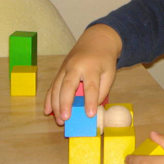 1歳半検診で積み木を詰めるか、という試験があるが、この少し前に購入したHABAの積み木。色といい、形といい、私はとても気に入っている。もっと大きい積み木もあるのだが、大きくて重いので、投げたりされると危なくてしまってしまった。このHABAの積み木を久しぶりに出したところ、たった数個の積み木なのに、様々に組み合わせて、いろいろなものに見立てて楽しむボンに、すっかり感心してしまった。 立方体や、直方体、円柱のほかに、1つの面が湾曲しているアーチ型の積み木が入っている。この形の積み木で(箱に描かれているのだが)お城の門が作れるわけである。 それを、いきなりボンは反対向きにして机の上に置き、凹んだ部分に人形を寝かせて 「♪ゆーりかごーのうーたをー・・・ベッドなのよ!」 というのだ。ああ、なるほど。私は先入観から、トンネルや門を作る、という風にしかこの積み木を使うことができなかったのだ、とはたと気づかされた。だから、「アーチ型の積み木」なんていう名前をつけて呼んでいたのである。アーチという単語をボンが知らなくてよかった。私は、何にでもなりうる不思議な物体を「アーチ」と具体化することで、危うく、その積み木の可能性、そして、こどもの想像力を絶ってしまうところだったのだ。 ベッドだったものを立てると 「たつのおとしご」になるとはしゃぐボン。さらに、それに立方体の積み木を重ねて 「がしゃがしゃ」これにはびっくりした。確かに、あの、がしゃがしゃの機械によく似た形が出来上がった。 こどもの想像力、本当にたくましい。親がやってみせるという時期はもう卒業したのかもしれない。