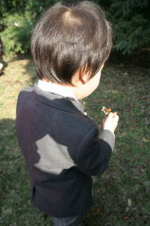 七五三のお参りに行ってきた。「満3歳?もしかして今年なの!?」と思ったのが先月。家にあるスーツを着せてお参りに出かけた。紅葉した葉があたり一面に敷き詰められ、その中にはたくさんのどんぐりが落ちている。ボンは石を拾ったり、どんぐりを拾ったり、お参りそっちのけで興味をそそられていた。帰りの車の中で「どんぐりさん、おかおないねえ」と言うボン。どんぐりには顔がついていると思っていたのだろう。どうよううたの絵本で、どんぐりころころの絵のことを言っているに違いないのだが・・・。明日は、拾ってきたどんぐりや石にお顔をかかせてみよう。