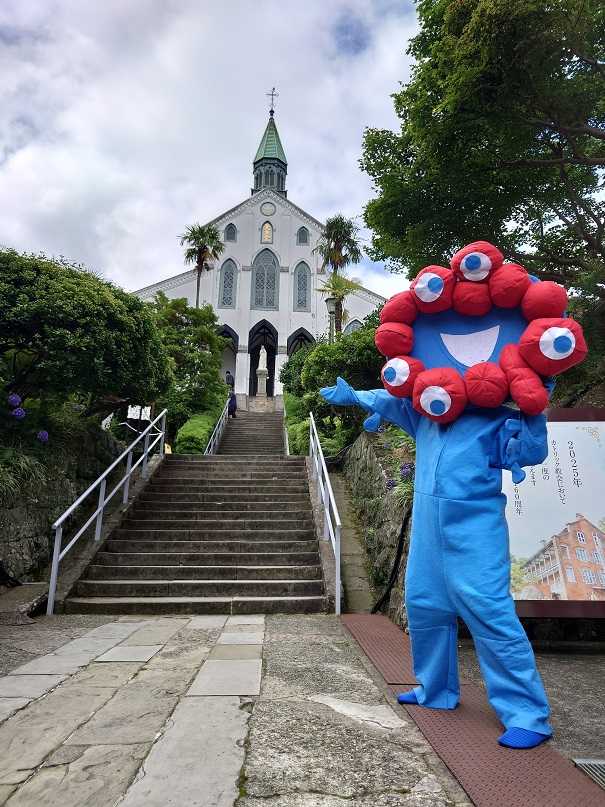 ミャクミャクのコスプレして、長崎県の大浦天主堂にやってきました。到着さすが、大浦天主堂。美しい。観光客さんもいっぱい。誰も目を合わせない(笑)正面で撮ってもみました。素敵~最後に、てへっ