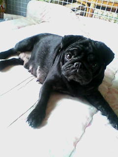 お腹がすいた子パグちゃん♪ララママを押さえ込んでます♪ララママは 好きにして って感じかな♪ちょっとお気の毒様♪この後 すぐに私のところに来ましたワン♪残された子パグちゃん達小さな足でお耳をカキカキ♪お互いに噛み合ったり、追っかけっこしたり♪一人で上手にうん○もするよ♪写真のララママ はりつけのようでしょ(笑)♪