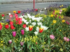 チューリップの花を 黄色のオキザリスと紫色のラベンダーが引き立ててくれて 花盛りの畑です♪