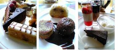 右:ザッハトルテ(生クリーム添え)、ストロベリーゼリーとアーモンドカスタード、レッドベリーゼリーとチョコレートムース、ヨーグルトアイス