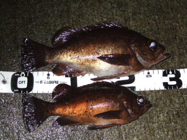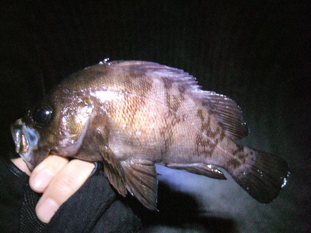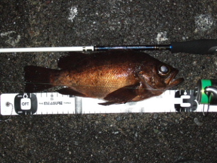 またまた懲りずに?いや昨晩からの調子にのってメバルを狙いに行ってきました釣れたのは下の2匹だけですがアタリは数多くバラシも数多くあり楽しめましたしかし今後の問題も発生僕の好きなポイントはシャローそして足場は低い場所が多いんですでも今夜の場所は堤防の上から水面まで3m弱何が問題か?写真の小さいの程のサイズは良いのですが大きい方から上のサイズになるとタモ入れの時の魚を浮かすタイミングでライン《3lbフロロ》が細すぎてラインブレイクするんですやっぱりこれ以上のサイズを高い足場から狙う時はリーダーを組んだ方が良いみたい次回はリーダー組むかラインを4lbに太くして試してみる予定です