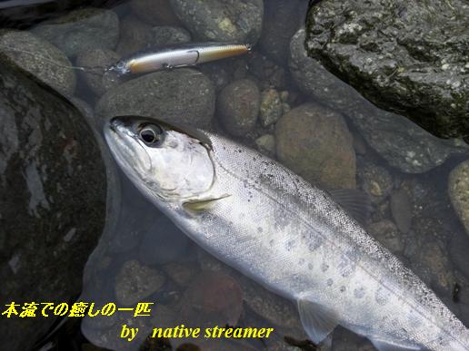こんばんは3月末からのヒラスズキも春のパターンは一段落した感があります次の夏のドアは叩いてるのですが反応はあるのに開けてくれませんそこで休日の昨日は癒しの渓流へ行くと決めてましたところが…前夜からの雨で泥濁りですはぁ~まぁ行くだけ行ってみるか釣り人の性で行けば投げたくなります泥濁りの中を黙々と投げ倒します釣れる気配が非常に少ないのにも関わらず…僕の渓流はミノーオンリーなのですが昨日は2アイテム追加して持って行きました一つはスピナーの【エディ】2回ほどアタリがありましたがフックアップせず久しぶりに投げると新鮮ですねスピナーってブレードの回転で流れを読めるしね変な話ミノーだと流れに対して誤魔化しが出来ちゃうし もう一つのアイテムはバイブレーションの【カイモ】渓流じゃ珍しいです淵ではかなり有効なアイテムとなるハズ届かなかった、あの場所を攻めれますどのように流すのかは今日発売のギジーに出てますよまた別ページには、なにやら見た事あるオッサンの姿が……出ちゃってます で!肝心の釣果は釣れたのは、このオチビちゃんトラウトチューン55HWで釣りました結局ミノーでしたが状況が状況だけに勘弁してくださいよくぞカフェオーレ色の中でヒットしてくれました取りあえずキャッチ出来たので癒されましたよしかし1ヶ月ぶりの川鮎は立派に成長してますミノーにもアタックして来ますこんなに大きくなってましたまた休みの日に増水してたら鮎釣りの方の邪魔にならない様に出かけてみる予定です しかし今夜はヒラスズキに良さそうな風がビンビンに吹いてます誰か釣っちゃうんでしょうね夜中に電話が鳴れば誰がが釣った報告う~ん気になる夜は長い…