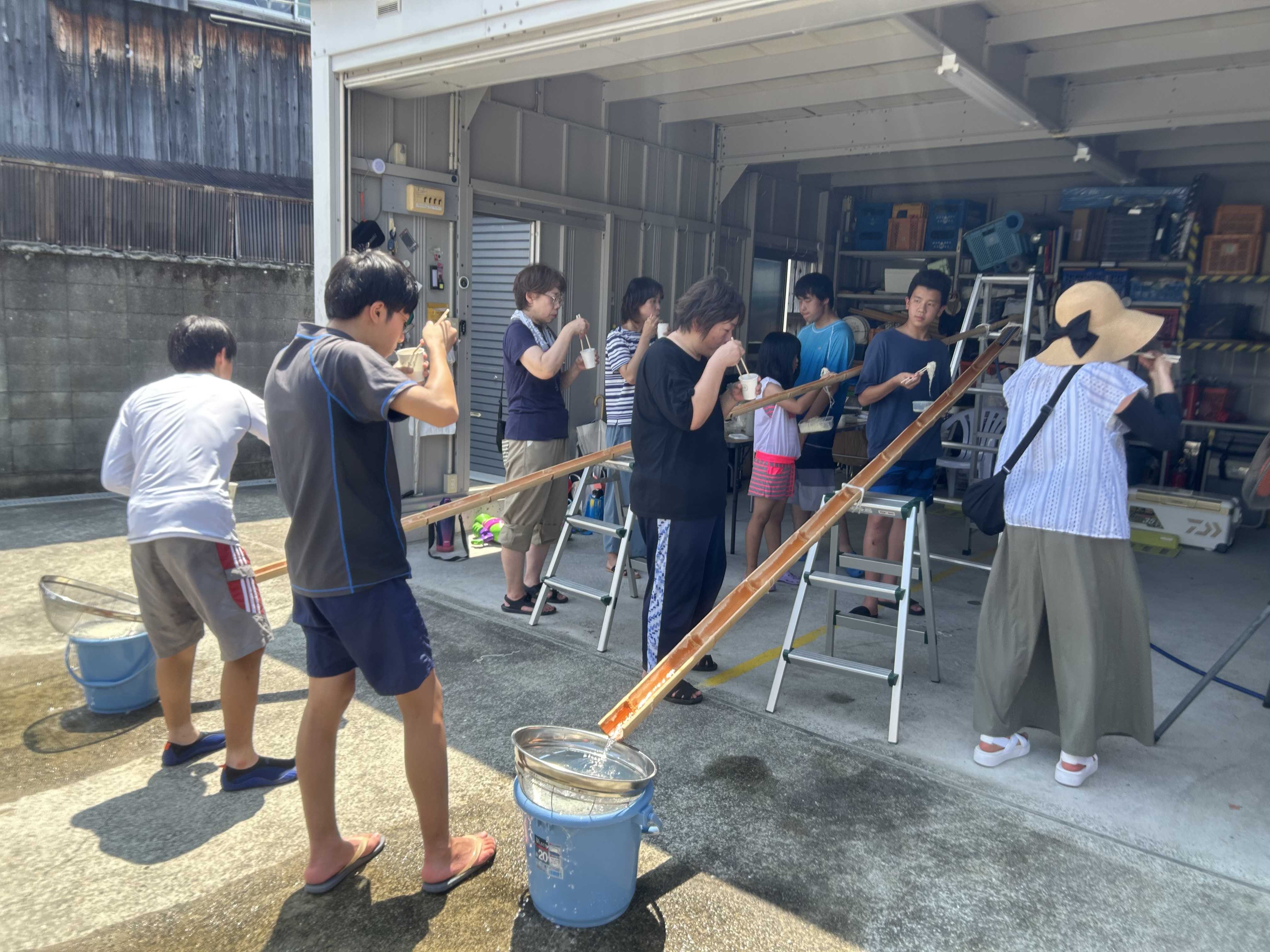 8月12日(月・祝)に、事務所近くのKさんの駐車場をお借りして、今年も水遊びを楽しみました。しかも今年は念願の流しそうめんもすることができました!コロナがあってずっとできてなかったので、久しぶりにできて大喜びの子どもたちでした😊どんどん大きくなる子どもたち!片付けも自分たちで進んでしてくれて、成長を感じました感想・久しぶりに流しそうめんができてよかった!ネギとか薬味も入れたりトマトを流したり色々できてよかった!水遊びも水が冷たくて涼しく楽しめた!来年もしたい!・コロナでずっとできてなかった流しそうめんを5年ぶり?にすることができました!子ども達が大きくなって、食べる方だけでなく、流す方も率先してやってくれたことにも成長を感じました!母もしっかり食べることができました。そうめんだけでなく、ちくわ・魚肉ソーセージ・ミニトマトも流れてきて盛り上がりました!スライダーのように転がってきておもしろかったです。水遊びも、新たにバナナ型シャワーが登場して楽しそうでした。井戸水を使わせてもらえたので、水が冷たくてとても気持ちよかったです。また来年もできるといいな〜😊・水遊びの時は楽しいしか言うことないです。またやって欲しいです。 ・いつもありがとうございます。毎年、水遊びの時は暑いのですが今年は特に暑い!私はずっと日陰にいましたが、子供達は井戸からの水を使って遊ばせてもらいとっても気持ちよかったみたいです。流しそうめんは普段食べているより竹の筒を通して流したら美味しさアップしで最高でした。 ・流しそうめんはお家でできないから、とても楽しかった。またやりたいです。 ・今年もみんなと水遊びができて楽しかった。来年もできたらやりたい。・久しぶりの流しそうめん 、子ども達と盛り上がれて楽しかったです。大人も流れてくるそうめんや変わり種のプチトマト、ちくわ、魚肉ソーセージをお箸で掴むのに必死でした(笑)水鉄砲遊びも大人も数名びちょびちょになって童心に返りました(笑)またやりたいです。 ・最近暑いけどその中で涼めて良かったし、夏休みで友達と会う機会になってめっちゃ楽しかったです!・楽しかったです。流しそうめんもおいしくて楽しかったです。おかしやアイスもおいしかったです。ありがとうございました。あとプールも楽しかったです。ありがとうございました。 ・とっても楽しかったです。井戸水がすごく冷たくて気持ち良かったです。竹を使った流しそうめんも子供の頃を想い出し、夢中で食べたので食べすぎました。お菓子やアイスまで用意して下さり、ありがとうございました😊
