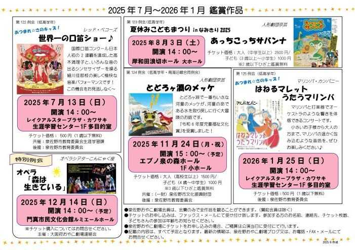 第29回 子どもえんげき祭 in きしわだ 2022 2022年8月17日(水)〜21日 (日)岸和田市立・浪切ホール※泉佐野おやこ会員なら、会費のみで観ることができます!!正会員・家族会員:2作品選択できます。賛助会員:年間作品の中から演劇祭を希望すると、1作品選択できます。プロ劇団の作品やアマチュアの作品、あそびのコーナーなど、多彩な内容の催しがいっぱいの子ども演劇祭です。好きな作品を自由に選んで観ることができます。作品内容はこちらを見てね 子どもえんげき祭inきしわだ会場はこちら 岸和田浪切ホール