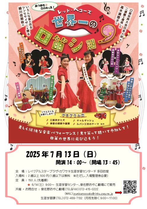 2025年7月13日(日)開演14:00(開場13:45)、レイクアルスタープラザ・カワサキ生涯学習センターにて、レッド・ベコーズさんの世界一の口笛ショーを開催します!小さいお子様から大人の方まで幅広い年齢の方に楽しんでいただけますので、皆様ぜひお越しくださいませ〜😊チケットは2025年6/14(土)〜販売開始です。生涯学習センターでご購入いただくか、泉佐野おやこ劇場へメールでお申し込みください✨チケット代は500円(1歳以下無料、ただし入場整理券は必要)です。