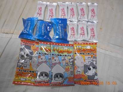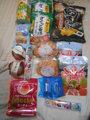 今回はお菓子の種類がたくさんで、見たこともないお菓子で感激です。沖縄産バターフィナンシュ、ベイクドショコラ、ぷっちょというキャンデイ、アーモンド入りでオニオン風味の米粉スナック、コアラのマーチ、もっちゅというグミが新顔です。またまた生きる元気が出ます。貯まった楽天ポイントでほぼ半額です。賞味期限過ぎですが、風味は変わりません。ごまもちも堅あげポテトも大好きです。
