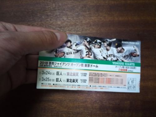 知人から家族でどうぞ、とジャイアンツのオープン戦の招待券(自由席)をもらったのです。昨年もらったときは勝手が全くわからず座席が取れずに立ち見となり全く試合が見れずに切ない思いをしました。で。今回は少し準備をしました。が、チケット引換券と勘違いして準備をしたために多少残念な結果になりました。ただ、概ね満足な結果となりました。うちは妻と子供二人の4人家族ですが私と息子の二人で座席の確保を行うことにしました。14時開始のゲームだったのですが入場は12時からでした。チケット交換の場合は10時から手続き開始との事だったので勘違いしてた私は9:20頃現地に行きました。これは座席を取る上でも必要だったので結果オーライでした。現場について勝手が全くわからなかったので早速立っていたガードマンにルールを聞いて自分のチケットが引換券ではない事に気が付きました。問題なかったけど。で。チケットに記載されている入場口(40番)へ直行。人はまだそんなに並んではいませんでした。ルールとしては一人に付き4人分まで席の確保が出来るようでした。この時点ではチケットの確認は無いのでチケットはなくても場所取りは可能です。で、新聞を敷いてガムテープ(布が後処理が楽で推奨されてます。)で貼り付け、新聞に名前と人数を書きます。これは離席のための手続きです。私はこの準備をしていなかったので息子に一人で待ってもらって近場のコンビニ(水道橋駅側にあるセブンイレブン)にガムテープと新聞とマッキーを買いに行きました。何時から離席オーケーなのかはわかりませんが座席確保の儀式を終わらせた10時頃には離席もオーケーになってました。ガードマンが11:30までに戻るようにアナウンスしていました。で。息子と辺りを散歩しのんびり戻ったら10分遅刻。座席取りが意味がない状態に人が並んでいました。これは5分前には戻っておいた方が良さそうです。すでに行列になっている中、自分たちの新聞を見つけ剥がしてその場所で待機しました。そのまま12時に入場開始。まだ、妻と娘はきません。チケットを持ってないと座席が取れないかも知れない!と不安になりましたが妻と娘は優雅に昼食中だったようなので流れに身を任せる方向で。まず、ゲート前で荷物チェックが有りました。カバンを開けて中を確認します。なお、飲み物はソフトドリンクであれば500mlペットボトルは持ち込み自由、食べ物も制限なし、アルコールは入場後に紙コップに移すことになりますがこれも本数の制限はありませんでした(2018年3月現在)その次はチケットの確認です。一人一枚と言われチケットを見せ半券を切り取られます。残りの家族は入れるのか不安になりそのへんの疑問を係員に聞いたらチケットの受け渡しを回転ドアのすぐ外のスペースで行えるそうで問題ないとの事でした。ホッとして4人分の座席を確保。息子と写真撮ったりスマホいじったりしながら楽天選手の練習を見て待ちました。その後13:30頃到着した妻と娘にチケットを渡し任務完了。試合は最初リードされながらも逆転勝ちでスパっと終わり非常に楽しかったです。妻に持ってきてもらったツマミとハイボール2杯も最高でした。また、妻と娘は通路で亀梨和也を見たそうで大興奮してました。良かった良かった。もし同様の機会があったら新聞、ガムテープ、マジックペンは忘れずに。ゼブラ/ハイマッキー 太字/細字 黒/MO-150-MC-BK