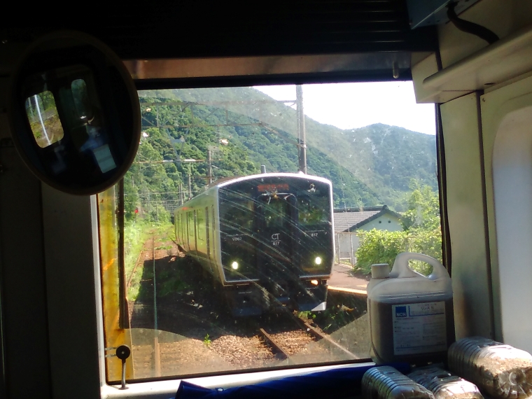 農業大国鹿児島県はコーヒーも作っている。産地は沖永良部島で、其処で採れたコーヒー豆を使っているカフェが霧島市の日当山温泉にあると知った。ローカル新聞に出てた「コーヒーゼリーパフェ」が美味そうだから、其れを目当てに行ってみることにした。まずは鹿児島駅から日豊本線に乗るのであります。竜ヶ水駅で列車交換。乱舞する昆虫の破片がフロントガラスにこびりついて前が見えにくい。普通列車の窓が異様に汚くて、折角の景色がよく見えない。植物が茂り過ぎて線路も見えにくい!是が日豊本線の日常の光景であります。帖佐駅で降りてイオンタウン姶良で昼食。バーガーキングなんて初めて食べた。何じゃこの昭和アメリカンな世界観は!スパイシーチキンバーガーを食べたのだが、小さい子供さんは無理と云えるほどの辛さ。意外と大人向けの一品なり。次は電車ではなく鹿児島交通バスを使うのであります。帖佐バス停で日当山温泉へ行くバスを待つ。道路はクルマが絶えず行き来しているが、イオンタウンから帖佐バス停まで、歩行者一人さえ出会うことは無かった。道を歩く人など皆無の超クルマ社会なんだろう。何でもいいが、バス停の後ろにある「家庭倫理の会姶良」って何なんでしょうか。乗ったバスは、鹿児島中央駅発の長距離バスであります。途中、加治木町の市街地を走るのだが、数ヶ月前に所用で加治木町の文化ホールに行ったことがある。建物の前にあったモニュメントは、無形民俗文化財に指定されている「加治木のくも合戦」~雌の蜘蛛同士を闘わせる奇祭であります。加治木を過ぎると、バスは国道10号線日向街道をひたすら東へ進む。桜島と錦江湾を望むいい風景だ。鹿児島交通バスの窓はピカピカであります。乗客が拙者と嫁さんの二人だけなんだけど、此の路線は維持出来るのだろうか。バスは約40分で日当山温泉に到着、沖永良部のコーヒーを味わえる「ノアコーヒー」に入る。店舗内は土足禁止でスリッパに履き替える必要がある。思わず反射的に駕籠の中にあるスリッパを取ろうとしたら、其れは使用済みのもので、消毒したのを店員さんが持って来て呉れた。バス停から暑い中を歩いて来たので、永良部コーヒーゼリーパフェは最適解だった。コーヒークリームにまぶしてあるコーヒーの渋みが素晴らしい。正しく大人の為のパフェである。沖永良部島でコーヒーを生産し、ブランドとして育てて行くなんて、夢のある話である。じっくり味わって応援するとしたい。隼人駅方面行のバスが来るまで「西郷どん村」で時間を潰す。日差しはいよいよ強くなり、空が燃えているような感じ。せっかくパフェで冷やした体も一気に汗だくだ。是までの経験で、酷寒や酷暑に限っていい写真が撮れるのも事実であります。→ホームページ側でもいろいろ写真展示しています。最後は隼人駅から日豊本線で鹿児島駅まで。鹿児島駅の駅舎は建替えられており、例えばトイレの入口には薩摩切子が展示されている。鹿児島駅の写真とかは→こちらからどうぞ。↑のサイトはこちらから・・