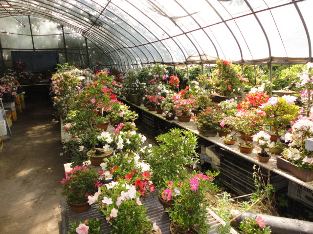 ハウスの中は、さつきでいっぱいです!まだまだこれから色んな種類のさつきが開花しますハウスに入りきれない物もいっぱいですよ苗は400円から盆栽素材もいっぱいありますよ!ぜひ、遊びにお越しください愛好会の展示会も26日まで開催中