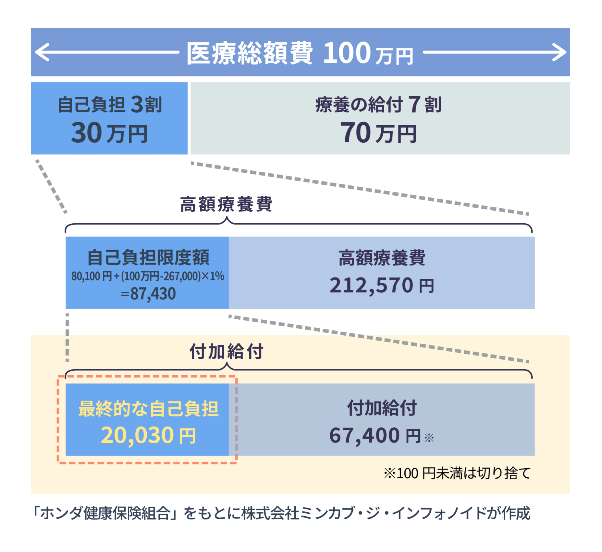 病気や怪我で国(国民健康保険)の高額療養費制度適用になると、平時の3割負担が、年収に応じて何段階かで緩和(減額)され、入院時のマイナ保険証利用か(家族が)退院前に市役所で手続きをすれば、制度の負担上限額以上の請求は病院から来ない。3割請求が来た場合でも、退院時に払った上で、市役所で後日に制度申請すると還付がある。これだけですごい制度…但し負担と受益の世代間格差が大きいので受益者(主に高齢者)はもっと負担すべきという議論は進んでいる。先日健康保険組合関係の冊子を見ていたら「健保組合による付加給付」という項目を見つけた。「付加給付」は、高額療養費制度により、3割以下に緩和された自己負担額に対して、健保組合が組合員・家族に独自で付加の給付をする制度。健保組合は企業単位や職域協会など多種多様で、付加給付の制度は各々に設定が異なり、制度のない健保もある。尚、公務員・私学教職員等の共済には同様の制度があり、国民健康保険には制度がない。大手企業の健保組合の場合「個人負担は1ヶ月・上限20,000-30,000円」としている例が多く、これを超えて払った自己負担額は後日付加給付として振り込まれる。上記の画像は「保険医療総額100万円」x「ホンダ健保組合」x「ある年収の人」の例で、ザックリ100万円→3割負担なら30万円→高額療養費制度で自己負担9万円→ホンダ健保独自の付加給付で7万円が後日給付→最終的な自己負担は2万円になる。トヨタも20,000円…このあたりがトップランクと思われる。一部健保組合のスーパー制度だ。この健保組合の会社員(家族)は、大病・大怪我でも、保険適用医療については、費用がほぼ掛からないことになる。「民間の医療保険は必要なのか」というところまで話が行ってしまう。ただ、大病・大怪我は何かと物入りで、保険適用外の医療や費用(差額ベッド代等)もあり「会社員」であっても働き方によっては無就業で給与が減ったりするので「民間の医療保険は不要」という結論にはならないと思う。2015年に入院した時は個人事業主・国民健保だったので、付加給付はなかった。画像を見ると、健保組合の負担が心配になる。100万円→個人負担2万円、国の負担21万円、健保負担77万円(病院に70万円・本人に7万円)。該当する人には素晴らしい制度だが、健保組合がサステナブルではないように思う。