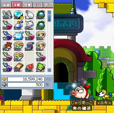 こん~^^今日から9月ですね^^この夏、大阪は暑かった。。。8月は1ヶ月連続、最高気温35度↑だったようです。。。ε=Σ( ̄ )それも9月とともに秋モード?昨晩の雨で、今朝はすっかりさわやかな秋モードになってました(でも、また暑さが戻ってくるとは思いますが^^;)空は、すじ雲とうろこ雲~歩いていても、暑くない~^^ちなみに事務所の新しいエアコン、明日取り付けられるらしい('〇';) さて、今日のメイポ~まずはルディから、ビートラビットへ飛ぼうと、テレポストンを作動させたつもりが。。。ポワン!ん?あれぃ。。ピグに変身してるー!(ノ_-;)そうなのですアイテムウィンドウに注目よく見ると、ピグ変身石の2つ上に、本来の高性能テレポストンが・・・あまりに急いでいたもので、”形”をちゃんと認識する前に、”色”で判断したのが悪かった。。。そのまま、今度は本当のテレポストンで移動・・・これじゃ、狩りできない;;変身石 無駄に使ってしまいましたo(´^`)o 戻る。。。ε=Σ( ̄ )ハァービートラビットの太鼓は、、、500個になりました(;´▽`A``はたと、思い出すたしか、マイスター将軍クエもビートラビット狩り(クエ品集め)だったと・・・クエストウィンドウで、チェックすると、、、!。。。まだ、そのクエ 受けてなかった;;クエが終わらないうちに、受けてこないといけないが、あいにく、地球防衛本部&ルディワープカプセルは倉庫;;。。。!ここ(エオス塔57階)からドアを出すと、、、あわよくば、地球防衛本部?だめでも、ルディに行けるから倉庫からカプセルを出して、、、またドアで戻って。。。(*'ー'*)ふふっ♪やってみよう~ポチッドアをくぐった先は、、、ルディでしたσ(^_^;)アセアセ...おk おk 早速倉庫へ~ゴソゴソ・・・ん?んん?!見ると、目の前に爽sが立ってました(⌒▽⌒;)話しているうちに、ドアが消えた(・_・;予定変更^^;ビートラビットは、、、また明日にしよう~さて、しばし近況報告などしていると、爽sのお友達(すごく高レベプリさん)が通りかかる^^先輩プリさんの人気度を上げてみる^^さらに、氷メイジ友 あんゆんさんが来てくれた(*^^)なんと、わざわざ ビートラビットの太鼓を渡しに来てくれた~♪しかも、次々に太鼓を落としていくあんゆんさん(ノ゜~゜)ノ全部で、400個近くもらってしまいました。・゜゜・(≧д≦)・゜゜・嬉泣きさらに、魔法の石、召喚の石までいただいて、本当に、本当にありがとう~♪ アリガトォあんゆんさん落ち(*^o^*)/~ バイ (*^-^*)/~バイ (*^▽^*)/~ マタネッ♪さて、残り時間もあと半分後半は、狩りに出かける^^vまずは、バイキンクエを消化~バイキンマップに着いて、空きchを見つけ、「よろ~」と言った瞬間、いきなりのエラー落ち;;↓ 落ちる瞬間の貴重な?SSですσ(^_^;)アセアセ...その後もう1度同じエラー落ち;;今日のPCは調子が悪いかも。。。狩りの方は、補助ということで('-'*)エヘルディは、↑↓移動時につかまる、ロープを使えば、スタンを気にせず、楽にスキルを掛けられるのが助かりますね^^今日は、さらに、今日は隠しマップ=Mバイキン狩りへも行って見る^^順調にMバイキンも狩り進んでいたのですが、途中、爽sが消える(強制落ち)Mバイキンマップに取り残される1人と1匹(ドラゴン)じっと待っていてもつまらないので、プリ&ドラゴンで、Mバイキンソロ狩りをしてみる~いつもながら、非力ですね (_TдT) こうなったら、1匹でも、群れてても同じ!Mバイキンの大群と戦う図?^^;それにしても痛いですね。・゜゜・(>_