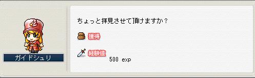 こん~^^今日いつものように日々の買い物に出かけたのですが、想定外の買い物をして、いざ、食料品売り場へ回った時に、お財布の中のさびしいこと (T_T)しかたありません、出直すのは嫌!なので、お財布に優しい買い物となりましたかごに1つ入れるごとに、ぶつぶつと暗算^^;相方用のビールも買って、(これはビール券でクリア~)、支払終わったあとの、残金408円でした (T▽T)アハハ!結果よければすべてよし~!? (^ー^* )フフ♪さて、今日のメイポ~その1所用前に1時間イン^^ロビンソンさんの船にいたので、とりあえず、オルビスにいるガイドシュリのところへ出かける破れた旅行チケットを渡すが・・・クエはまだ続く?ε=Σ( ̄ )ハァー旅行チケットを直すのに、サンフィクシーとルナフィクシーのETC各、50,30それに、ダイヤモンド3個必要とは。。。とりあえず、保留にしておいて、旧へ帰還^^新学期も始まり、時間的に空いてるのでは・・・と大仏マップの空きchを探す^^武器をはずして、狩場荒らしにならないよう気をつけながらchを回っていくのですが、とあるchで、いきなりの天狗接触死(/□≦、)エーン!!半分くらいch回ったのですが、その1/3に天狗がいました。。。そこへ、DK友げんまさんから、狩場確保したとの連絡あり^^時間制限1時間弱で、グル狩をしていただくDKさんとのグル狩は、HBを掛けてもらえるので、MGなしでも、気分的に少しゆとりが出来ますね^^ヒールで、← →へ移動して、真ん中にいる、げんまさんの所に、珠蟲姫を集める作戦です^^さすが、戦士さん、珠蟲姫を集め終わり、次なる珠蟲姫を集めてくる間、狩りながらも、HPを持ちこたえてるちなみに、HPゲージを見ていると、空に近いところから、満タンにするのに、2、3回ヒールが必要ですそんな感じで、途中、MG掛け損ね墓ドロポと、最後にチャット墓ドロポは出したけど、楽しく?珠蟲狩りができました~目的だった、珠蟲姫の着物のきれはしもゲット^^げんまさん、ありがとう~&また、機会があったら狩りましょう~♪落ち(その2)久しぶりに旧に戻ってきたので、出来そうなクエを受ける&消化~ショーワの映画館前にいる、ふらのさんからクエを受けるなんでも、地球防衛隊方面に行かなれればいけないらしい^^;これは、また今度。。。次~リスのベイソンさんのところへ~クエを受けたとたんに、クエ消化マークが(*_*;報酬も、経験値100、1000メルと、それなりに?σ(^_^;)アセアセ...次~ペリオンにいるイヤンさんのところへ~すべすべお肌クエらしい('〇';)きゅうり集めなら、すぐ出来そう^^vということで、再び集落マップへゴー♪沸きもいいし、サクサクと集め終わる^^v報酬は。。。チューチューアイス50個でした^^ここで旧でのクエはひとまず中断船の時間ぎりぎりなので、エリニアへ急ぐー船乗り場に着いたら。。。○時29分 。・゜゜・(>_