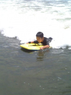 九十九里でのヒトコマ。すごーく遠浅なので、カッチも挑戦できました。体重が軽いから、一旦波に乗ったらぶっ飛ぶこと!一度なんか、大波が来たのでパパが力いっぱいボードを押したら、50メートルくらいぶっ飛んで行きました。親ばかの私たちは「すごっ~!!!」と大歓声!が、波打ち際で立ち上がって振り返ったカッチ。ビミョーな顔。よく見ると膝から血がだら~。必死でボードに捕まってたあまり、どこで降りていいか分からなかった模様。貝で思いっきりすってました。だって、水深三センチのところまで粘るんだもん。そこ、海じゃないって。大波が打ち寄せたときだけ、水がくる陸だって...。