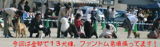 5日は岐阜のドッグショーに行って来ました。参加メンバーはファントム&き~やんです。ファントム君は先週、前肢をくじいていて全く練習が出来なかったのですが、ショー当日には肢も治り、楽しそうに走ってくれました。ちゃんとやってくれるかどうかとても心配だったのですが、なかなかお利口さんでしたよ結果はベビーリザーブキング(ベビーのオスの準優勝)でした。今回13犬種いたのでドキドキでしたが頑張ってくれましたよ。き~やんもまたまたエクセレントグループ。入院中の父ちゃんにカップをプレゼントしたいのですが道は遠い・・・