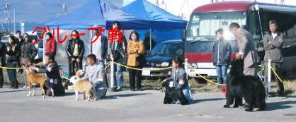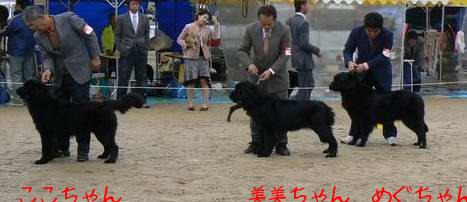 昨日の三原(広島県)のドッグショーのメインは何と言ってもニューファンメス組、ノンタイクラスのオーナーハンドラーでの3頭勝負でした。参加はジュニアクラス(9~15ヶ月)の「ここちゃん」これは実家のパパであるF氏のハンドリングでオープンクラス初出場、ヤングアダルトの美美ちゃん(こちゃんの妹です)をオーナーのH氏、アダルトクラスは「めぐちゃん」この子は「リキ君」のオーナーでもあるS氏がオーナーハンドラー・・・・みんなこの日を楽しみに、それぞれ練習を重ねたり、周りの私たちは誰がCCカードを取るかを賭けてたり・・さあ、誰が勝ったでしょうか?皆、ガチガチに緊張しています、ふふふ。ジャッジが最後に確かめるよう回って来ました。ウイナーズは何と一番年下の「ここちゃん」にそしてBOB戦は「こちゃん」と「ここちゃん」の母娘対決になったのです。3歳半の充実した「こちゃん」とわずか10ヶ月の「ここちゃん」、BOBは文句無しに母の手に!雨降りの中みんな良く頑張りましたもう1頭の参加犬、ボーダーコリーの鈴ちゃん(10ヶ月、ジュニアクラス)もブリード戦5頭の参加(ジュニア2頭、ヤング1頭、アダルト2頭)の中、母と共に良く頑張ってくれBOBを獲得、オープンクラス初出場(10月末までパピークラスでした)でCCカードGETです。おめでとう、鈴ちゃん昼からの総合戦では、母は「こちゃん」と「鈴ちゃん」2頭は引けないのでハンドラー友達のKさんに「鈴ちゃん」をお願いしました。「鈴ちゃん」は人懐こく明るい性格なので誰とでもOKの筈。最初は3頭後ろに並ぶ母を気にしてましたが途中からはきちんとしていました。結果は「こちゃん」がリザーブクイーン、「鈴ちゃん」がエクセレントグループ前日から降っていた雨でコンディションは最悪、途中からは寒さで我慢大会と化していたドッグショーでしたが、オーナーハンドラーでショーを楽しみ、総合戦も思わぬ好成績で帰りの足取りも軽かった私たちでした。