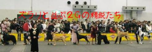 ブリードを勝ち取ったフラッシュ君、次はグループ戦です。2グループは激戦区でニューファンの他、ドーベル、ブル、グレートデン、シュナウザー、ピレなど強豪が沢山います。今回のインターで2グループはなんと13犬種、この中でグループファーストに上った犬1頭だけが最後のキング戦(ファイナルステージ)に立つ事が出来ます。表彰されるのも3頭のみなのでグループに入る事すら大変です。グループ戦のリングはブリード戦の時よりかなり広いので、フラッシュ君は絶好調、ハンドラーのM氏と共に素晴らしい動きを見せてくれました。そして、ジャッジはピックアップをまず前の方からバーニーズ、ブルドッグ、最後にフラッシュ君を指差しました。3頭を選んだ後、もう一度確かめるように1ラウンドさせた後ジャッジはフラッシュ君をファーストに、ブルドッグをセカンド、バーニーズをサードの席次に着けたのです。狂喜乱舞する母でしたファイナルステージはハンドラーM氏はアメリカンアキタをハンドリング、フラッシュ君は急遽、ジャスト君をハンドリングしてくれていたH君にお願いする事になりました。いきなり頼んだのに快く引いて下さったH君、フラッシュ君の大涎と戦いながら頑張ってくれました。我が家に来てまだ僅か2ヶ月のフラッシュ君がインター2戦目でファイナルまで行けた事で母は大満足です。ここで、ドッグショーの楽屋裏の恥ずかしい姿のフラッシュを見て下さい!「僕はちゃぶ台にしか乗れません」