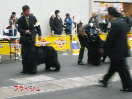 乱ちゃんホームレス事件ですっかり遅くなってしまいました。DVニューファンのフラッシュ君、我が家に来てわずか2ヶ月インター2回目の挑戦でなんとグループファーストを頂きました本音を言うとBOBは欲しかったけど、早く帰って乱ちゃんを探したかったのですが。当日のエントリー数はニューファンの雄クラスは、チャンピオン3頭、ヤングアダルト1頭でした。ヤングアダルト(15~24ヶ月)の雄は「ぶりちゃん」や「ガッツ君」の同胎犬のジャック君です。前日の連合展のウイナーズドッグでMCCを1枚GETしてます。ぶりちゃんに良く似た雰囲気の男の子ですが、顔はライ君に似ていました。チャンピオンの雄3頭の内、1頭は欠場で事実上は 本部展でBOB、先日の岐阜のショーでベストインを獲った犬とDV犬犬フラッシュの一騎打ちに・・・フラッシュ君、母が我が身を犠牲にしてトレーニングした甲斐があり当日はハンドラーM氏と共に素晴らしい動きを見せてくれました。途中、M氏に飛びついたりもしていましたが・・・結果は文句なしのBOB喜びに震えた母でした。(グループ戦の報告は次回に)