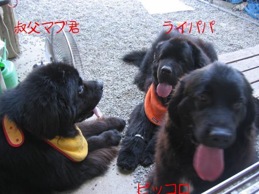 一昨日、1時間半かけてピッコロを連れてライ家へ訪問して来ました。母の可愛いファントム君に新しいご飯を届けることが今回のメインの用事です。ついでにピッコロを連れて行くことに・・・よ~く考えるとピッコロと父犬ライ君は初対面でした。母犬の乱ちゃんは何度も連れて行っていますが、ピッコロは行く用が無い・・・ライ君は乱ちゃんの事は良く認識しているらしく(きっと自分の妻と思ってる)、お散歩の途中で乱ちゃんに似た犬(イングリッシュセターらしい・・・)を見かけると大興奮して「こっちへ来い」と呼ぶらしいです。乱ちゃんの方も「夫はライ君だけ!」と思っているのか、ヒート中でも他のオスがマウンティングする事は許しません。交配の為、ライ家へ行ってもライ君一筋、マブ君には近寄りません。判っているのかどうか?疑問ですが、2頭の間には愛があるのでは?と思う今日この頃です。大騒ぎになるかな?と思いましたが、意外に大人しいピッコロ。ライパパやマブ君に遠慮しているのか?家でのピッコロとは大違いでした。ライ母さんにビスケットを頂き、これは遠慮なしに食べていました。父娘の光景はもしかしたら最初で最後かも知れませんね。家でジャスト&ピッコロのお祖父ちゃん&孫娘の光景はたまに見ますが・・・