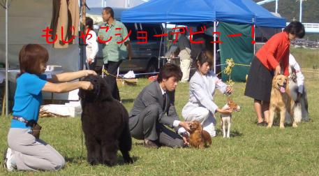 去る10月6日土曜日の加古川でのドッグショーで我が家の横着者NO1のもじゃこがショーデビューしました。我が家では1日の大半を寝て過すもじゃこ・・・呼んでも尻尾を振るだけか、伏臥したまま前進してくる超横着者・・・今まで我が家のニューファンでこんなまったりした子は見た事がありません。良く言えば大人しいのですが、勝手の良い時には走り回っているので私の目には横着者にしか見えません。こんな訳で母から半ば見捨てられていたもじゃこです。なんとリードを着けたのも本番で4回目(母も横着者でありました)、全くやる気のないもじゃこと母です。もじゃこが5分間立っていれれば奇跡としか言いようがないくらい、いつもごろごろしている子です。人に触られたら勿論寝転ぶし、それを起こす事はほぼ不可能です。起こそうとして触れば触るほどもじゃこは力を抜いていくのです。一度寝転ぶと二度と起こせないでしょう・・・頼むからリングで寝転ばないでと祈っていました。お願いだから母に大恥をかかさないで(だったらもっと練習しろ)と今回ほど願った事はありません。結果はまさかのリザーブクイーン強運の持ち主だったのか、パピーのメス組はわずか5頭のエントリーでした。パピークラスになってわずか2日目のもじゃこ。何とか個体審査は頑張って走ってくれましたが、2ラウンド目にはリードを咥えたがり止めさせるとストライキ「もうどうにでもなれ」とリードを咥えさせたままラウンド・・・リードを咥えると得意げに走りましたそしてジャッジはもじゃこを最初にピックアップ上位3頭が決まりジャッジがもう一度確認の為の触診に・・・頼むぞもじゃこ、立っていて!何とか立ったままいられたもじゃこですがこの後のもう1ラウンドで又もやストライキズルズルと嫌がるもじゃこをひこずりながら歩く母でしたこんなもじゃこを指差して下さったS先生、本当にありがとうございます。先生のお姿が神様の様に見えました。この日もう1頭、母がハンドリングしてのデビューだったH家の瑠瑠ちゃんはグループサード。初カードをGETしました。そして、もじゃこより一足先にデビューしていた「ジャック君」はベビークラスで見事にリザーブキング。一緒に記念撮影をして帰りました。総勢6名での遠足のようなドッグショー・・マナーの入っていない未熟な犬たちの参加でしたが久々に楽しめました。