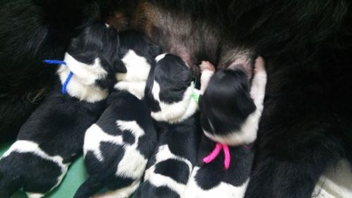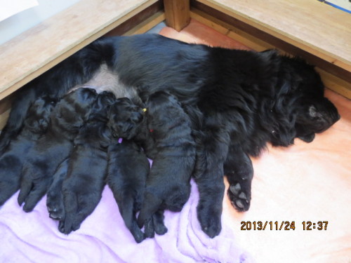 12月21日にランドシーアのBABYが生まれました。お陰様で10月10日生まれ、11月5日生まれの仔犬たちも全犬オーナー様が決まりホッとしたのもつかの間・・・21日の早朝5時34分に第1子誕生。。。。夕方までに8頭のBABYが生まれました。ランドシーアの男の子3頭、ランドシーアの女の子1頭、ブラック&ホワイトの女の子4頭です。みんな元気にさくらちゃんのおっぱいに吸い付いていますが、8頭いるとちょっとおっぱいが足りないみたいなので昨日から哺乳しています。年末のトリミングもあり乳母はとても忙しく体がもう1つ欲しい位です。この子たちに興味のある方はお気軽に090-8997-9129(日名)へお電話下さるか、住所氏名連絡先を明記の上jast713@ybb.ne.jpにメール下さい。