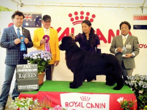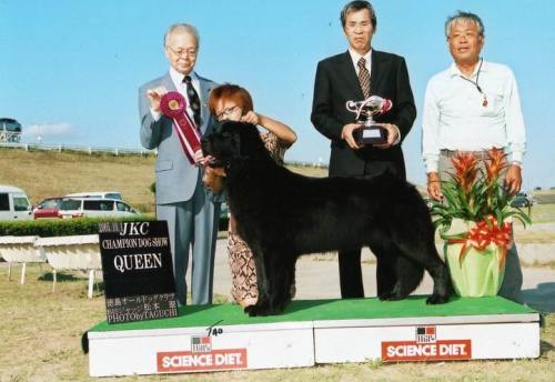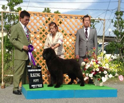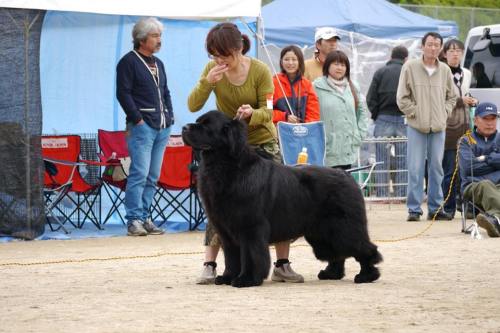 5月3日、4日、5日は尾道3DAY’Sのドッグショーです。ファミリーからの参加メンバーはまずはニューファン♂チャンピオンクラスの「レオン君」と♀ジュニアクラスの「おこげちゃん」が3日間、そして♀アダルトクラスの「おまめ」が4日、5日の参加です。3日、画像がありませんが「レオン君」がリザーブキングに輝きました。1歳代にして3回目の三賞入賞です。おめでとう、レオン君。3月21日生まれの仔犬たちのお兄ちゃんです。4日、レオン君はブリード戦を勝ち上がり(♂はジュニアクラス2頭、アダルトクラス1頭、チャンピオンクラス2頭)BOB&グループサードでした。おまめちゃんもブリード戦を勝ち上がり(♀はジュニアクラス1頭、ヤングアダルト1頭、アダルト1頭)BOB、そしてグループファースト、リザーブクイーンと素晴らしい成績でした。佐織ハンドラー&石内ハンドラーに感謝感謝です。。。我が家では野獣と呼ばれていた「おまめ」チャンピオンにリーチがかかりました。あと1枚頑張ってね!