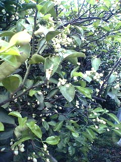 だいだいの花 (たまには詩人の振りしてみよう。。 wwww )草木深き離れ屋の 池の畔の一角に霞か雲か置き惑わせるだいだいの花のかほりに初夏の舞ふ白壁越しに クスリ と笑ふ夏蜜柑 さぁさあ みんな揃ったら 蒼い月夜に抱かれて楽しい宴のはじまりだ深いかほりに包まれて花と果実の饗宴が宵まで続くお庭には維新の風も そぉっと肩を竦めてちいさく 笑って過ぎてったそうして やがて だいだいはお役目終えて・・・土に帰す今 萩では あちらの白壁 こちらの白壁越しに 白い可愛らしい夏みかんの花盛りです 甘い優しいかほりは毎年のことながら萩っ子の待ちのぞむものの一つにあげられるほどです地元では 夏みかんの事を 「代々=だいだい」と呼びますそれは 果実と花が同時に木に存在する時期があり子孫繁栄代々 ということから語り続けられ とても縁起のよいものとして大切にされていますほんとに。。。見ているだけでたわやかな夏みかんの穏やかな様はほっとする空間を与えてくれるようです遠く 故郷を離れている ほら。。。あなたですよ。。。ダイダイの季節が いま 真っ盛りになりましたよ懐かしいでしょ・・・一息つきに 帰っていらっしゃいませんか ?本日起こしの ●志●病院のバースデイの一味様改めまして・・・・ お誕生日 ☆☆** v(o^▽^o)v**☆☆ おめでとぉぉぉ次は忘れずに言ってね・・・・ ぐみいぃぃぃぃって ^^;衝立の後ろに隠しとこう・・・・ぼそっ。。