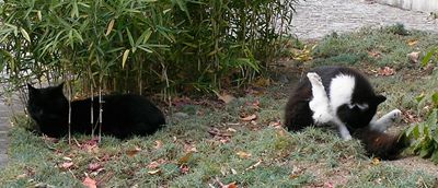 1.昨日の猫 公園を通ったら、また道路側に長毛種がいました。目を合わせないようにして通り過ぎました。 昼は今まで通りに、奥の植え込みにいて、侵略者がくる夕方は移動しているようです。 今朝、見たら黒猫と三毛猫が通りがかりに一緒にうろうろしていました。微妙に組み合わせが変わってきたのかもしれません。 今がチャンスかも・・・。(微妙な関係の二人)