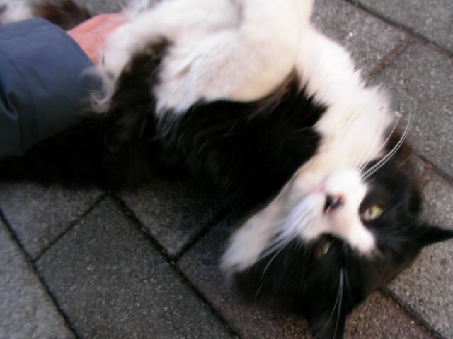 1.救世主現わる? 土曜から雨が降ったので、ビッショリ濡れているかと行ってみたら、日向ぼっこをしていて、体は意外にさっぱりと乾いていました。 例によってモフっていたら、中学生ぐらいの男子が近づいてきて、じっと見ていました。声をかけても無反応で「尻尾がすごい」と言って去っていきました。 表の中古屋さんで買い物をして、戻ってみると男子は母親と思しきおばさんと猫にソーセージをやっていましたが、私の姿を見ると猫はダッシュしてきてモフり開始です。 母親と話したところ、息子が「連れて帰りたい」と言っているということでした、「こんなに人に慣れているんですよー」とアピールしたんですが、性別を聞かれたので、オスと答えると「既にオスを一匹買っているので、飼えない」ということでした。 大きな家で、いつも人がいる環境で飼ってもらえる方が、私が飼うよりも絶対いいのですが、残念です。 惜しかったなー、幸運がすぐそこまで近づいてきたのに・・・。やっぱり私が保護するしかないのかなー。