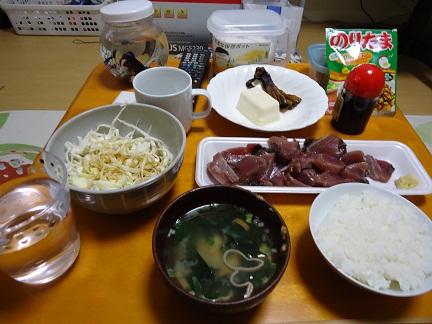 昨日は飲み会いってましたので、日記更新ができませんでした(汗で、その飲み会ですが、7時~9時までは普通に飲んでたんですが、10時~1時にかけての記憶がぶっ飛んでます。あ、いや、なんとなーく女子にうざがらみしまくったことを覚えています(滝汗お酒って怖いね。てーかなんかストライドっぽいことをずっとしてました。平衡感覚が崩壊したから常時頭がぐらぐらしてました・・・(涙1時に先輩にラーメンをおごってもらっているあたりで素面に覚醒。そっからは酒から逃げるように帰りました(汗お酒はほどほどが一番ですそして今夜の俺ごはん。カツオうめぇww今日の晩御飯は米、インスタントみそ汁、カツオ、やっこ、アナゴ、キャベツ、ゆで卵先生でした。和風っていいよねコメント返信フィロさんのりたまうめぇww結局飲まれちまったよ(涙コスコスさん愛知旅行にきたら、晩飯ぐらいあげますよ!ゆで卵先生は俺の恋人です。エックスさん野菜スープは材料さえあれば楽なんですw結局酔いました(涙電話はしなかった(キリ
