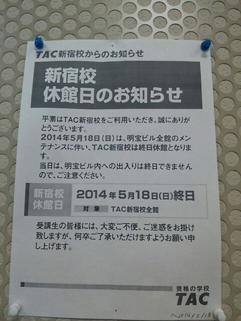 今期は日曜のクラスに通ってます。 好きな先生が日曜クラスを受け持ったので。 それに日曜のクラスに通うと、自習席確保に苦労することから開放されるから。 ホント日曜に自習席確保大変。。 そしたら今日は新宿校が閉鎖。 ありゃまー。 ターミナル駅にあるので各方面からみんな来るのにね。 私は今日で年金科目の講義が終わり。 来週のテストに向け、明日は1830には自習室行かなきゃ。 平成26年社会保険労務士試験まで、あと96日