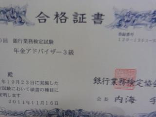 本日「年金アドバイザー3級」の合格証書が届きました。合格してました!試験3日後の解答発表をみて、合格目標点の60点を下回っていたので絶対無理だと思ってました。だから合格は、正直ものすごーく嬉しい!!!やったーーーーーーっ\(^o^)/これもずっと社労士で年金を勉強してきた知識の蓄積のお陰だと思ってます。勉強してきたことは無駄じゃなかったんだなと、嬉しくなりました。合格したからといって、私の受験生活が終わるわけじゃなく。前々いいことなかった私の2011年がちょっとでも報われてよかったなあ、と思いながら、来年の社労士受験の弾みになればいいなと。これからも負けずにがんばるーっ。フレフレ私ーっ。
